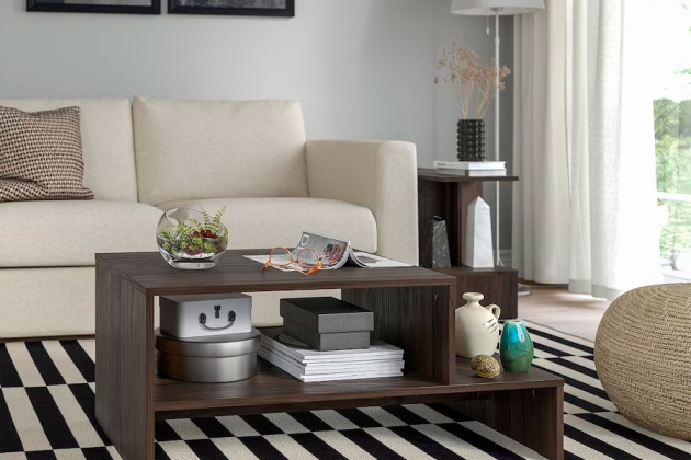 Una de las ubicaciones más clásicas y efectivas. Colocar la Holmerud en un lateral del sofá no solo te proporciona una superficie cómoda para tu taza de café, el mando a distancia o un libro, sino que también añade un elemento estético. Resulta especialmente práctica si tu sofá cuenta con una chaise longue, extendiendo visualmente el espacio y ofreciendo un soporte adicional justo donde lo necesitas.
