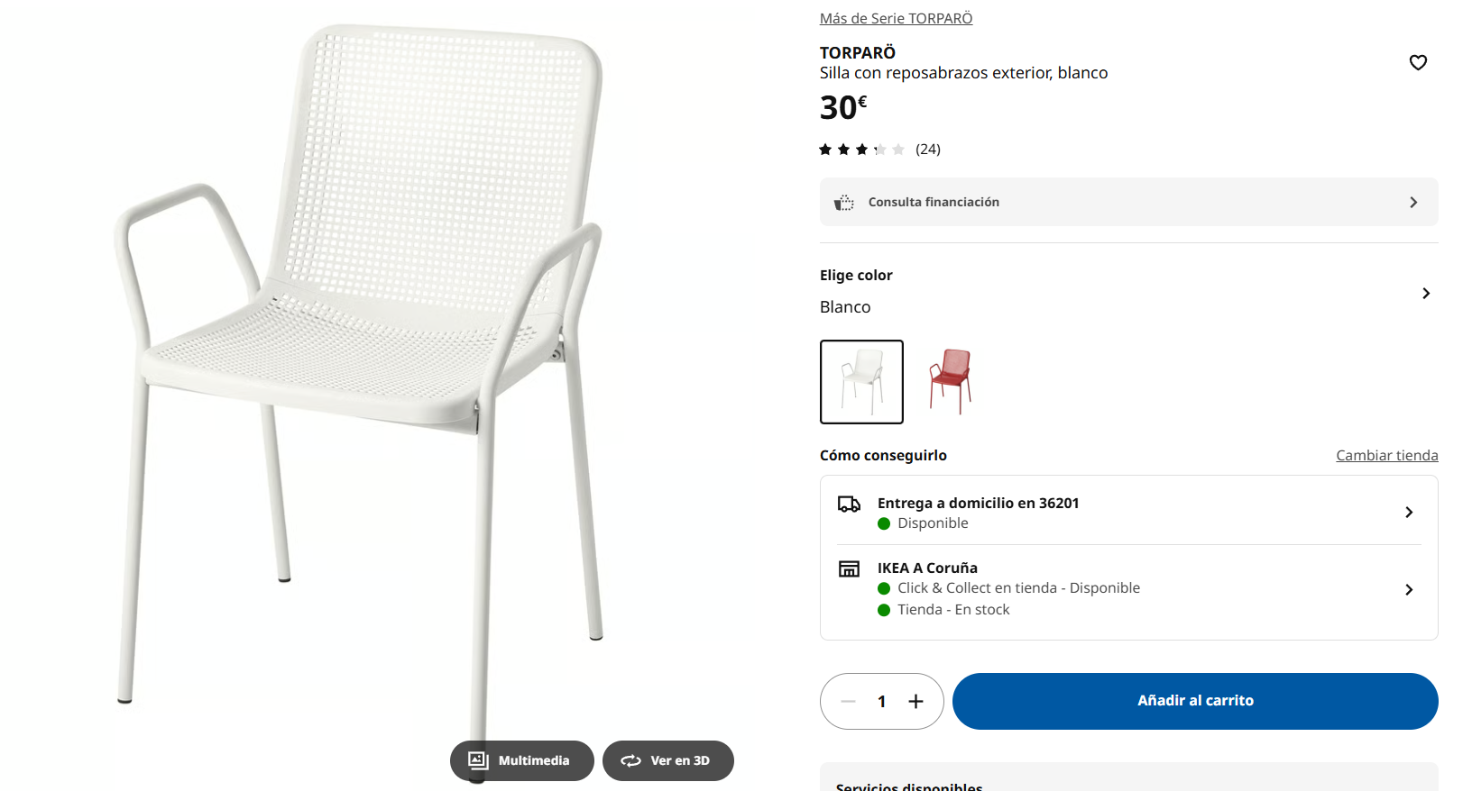 - Silla TORPARÖ (30 €): una auténtica joya por su precio. Esta silla de exterior, con un diseño minimalista, se integra sin esfuerzo con cualquier tipo de mesa. Su capacidad de apilado lo hace perfecto para optimizar el espacio en patios reducidos, y con un simple cojín, se convierte en un rincón digno de Pinterest.