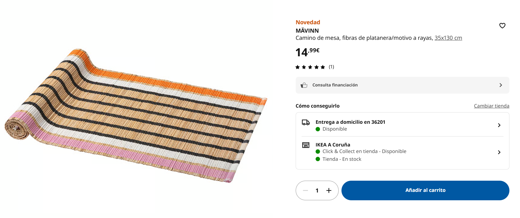 - Camino de mesa MÄVINN: elaborado con fibra de plátano y un patrón de rayas, aporta una textura natural y relajada a la mesa. Es perfecto para crear un ambiente cuidado y artesanal, tanto en el comedor como en una mesa auxiliar o incluso al aire libre.