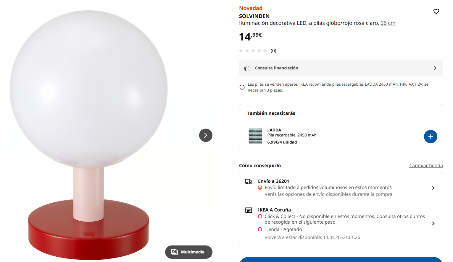 - Lámpara de mesa SOLVINDEN tipo globo: Un toque divertido y moderno. Su luz suave y color atrevido aportan personalidad al instante. Al funcionar con pilas, puedes colocarla donde quieras: en estanterías, mesitas auxiliares o incluso para una cena al aire libre.