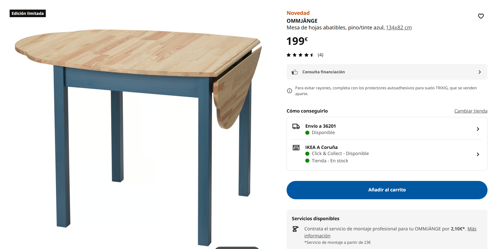 - Mesa de comedor Ommjänge con alas abatibles: Fabricada en pino teñido de azul, esta mesa no solo es bonita por su forma singular, sino también práctica, ya que ahorra espacio gracias a sus alas.