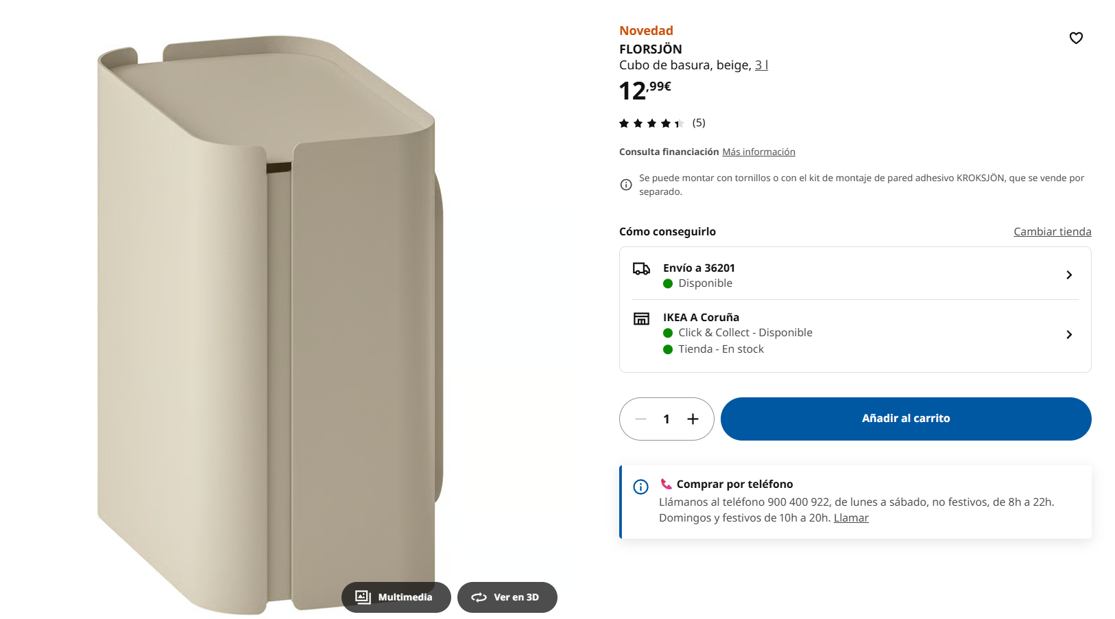 - Cubo de basura con apertura basculante: Este cubo de basura en color beige se monta en la pared, ideal para baños estrechos.
