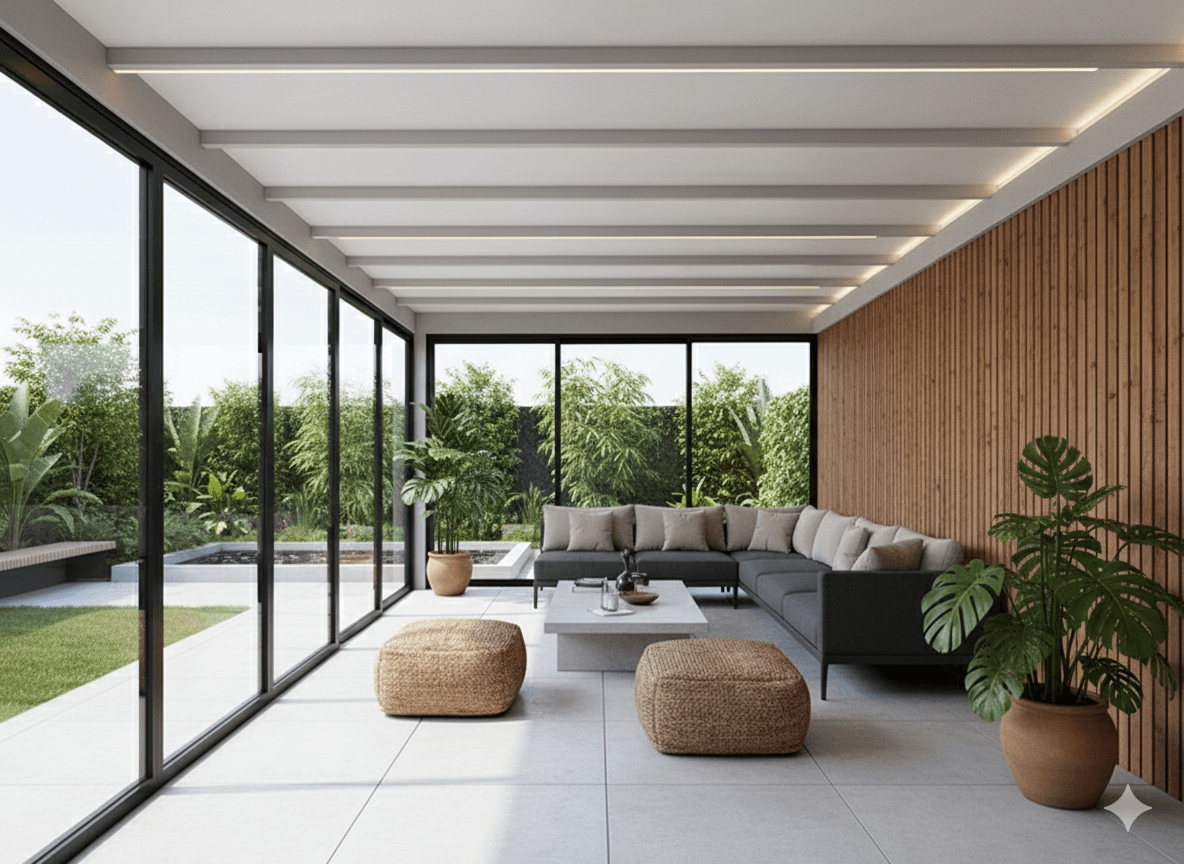 Como contrapunto, al cerrar las lamas en invierno, la entrada de luz natural directa se reduce, lo que puede restar algo de amplitud visual comparado con un techo de cristal abierto. Además, su precio es superior al de las opciones anteriores, reflejando su tecnología y capacidad de personalización (motorización, iluminación, etc.).