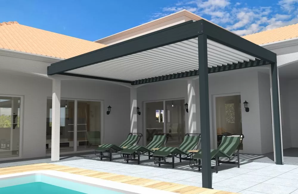 Entramos en una categoría superior de confort y diseño. La pérgola bioclimática, una de las soluciones más demandadas, se diferencia por sus lamas orientables. Estas lamas permiten una regulación precisa de la luz, la ventilación y la protección contra el sol o la lluvia.